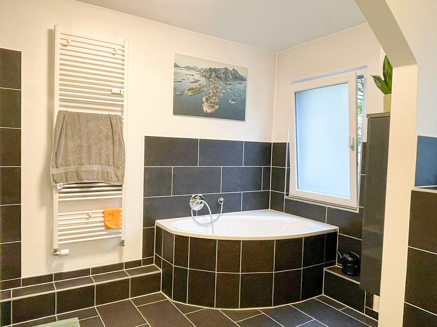 - großes Badezimmer mit Badewanne und Dusche