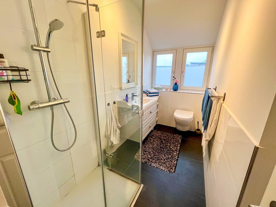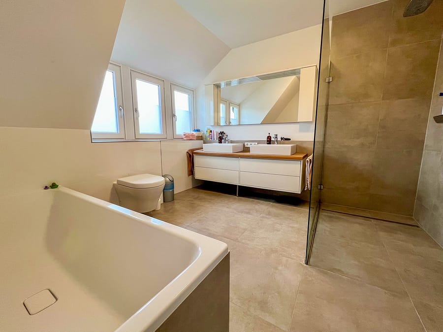 - Vollständige Kernsanierung: Elektrik (inkl. KNX-Smart-Home), Gas- und Wasserleitungen, Dach mit 24 cm Dämmung, neue Fenster (inkl. Panoramaschiebetür), Heizung, Böden und Bäder.