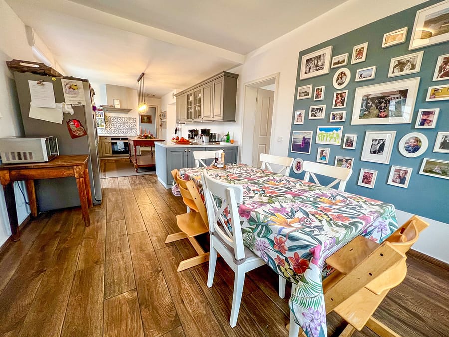 - Eleganter Wohn-/Essbereich mit Fischgrätparkett, Stuckdetails und einem modernen Spartherm-Kamin (10–11 kW).