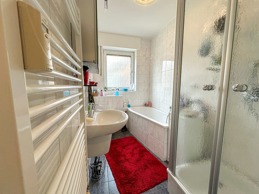 Das Badezimmer, mit Fenster, hat sowohl eine Badewanne, als auch eine Dusche.