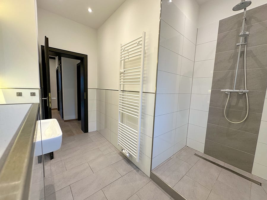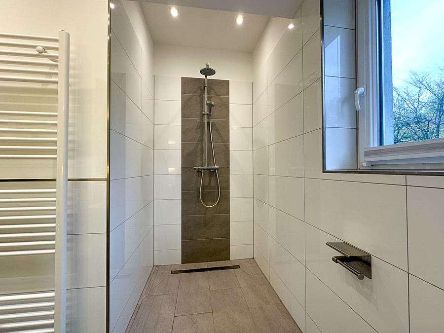 Beim Betreten empfängt Sie ein großzügiger Flur, von dem aus alle Räume bequem erreichbar sind. Das modern ausgestattete Badezimmer überzeugt durch eine hochwertige Dusche und ein Fenster, das für angenehmes Tageslicht sorgt.