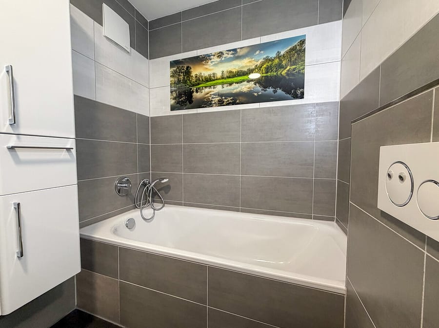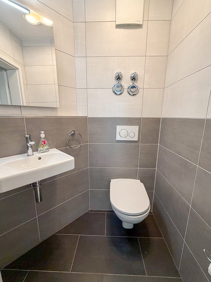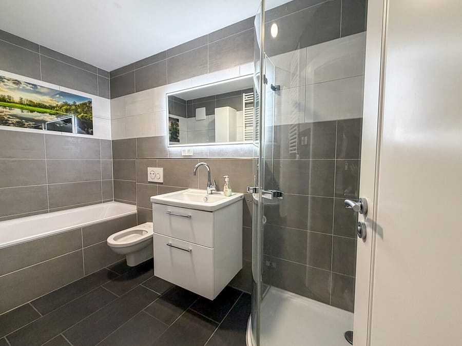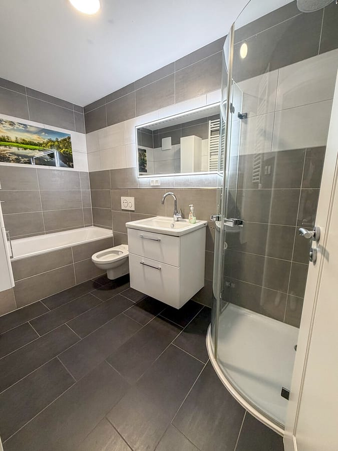 Die vollständig ausgestattete Einbauküche mit allen Elektrogeräten wird mitvermietet und ist sofort bezugsfertig. Das großzügige Badezimmer bietet sowohl eine Dusche als auch eine Badewanne – Komfort für die ganze Familie. Ein separates Gäste-WC ergänzt das Badkonzept ideal.